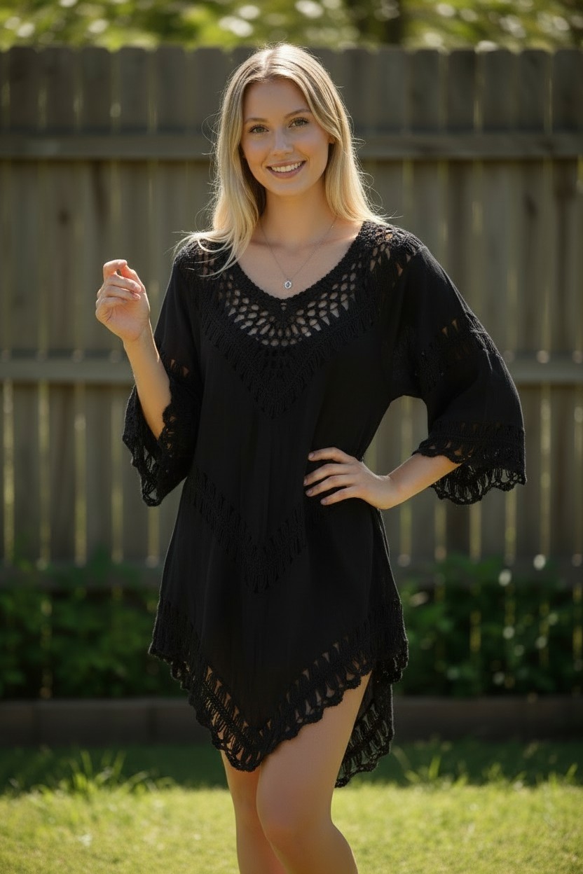 This elegant boho-style tunic features beautiful crochet detailing and a relaxed, flowy silhouette. Designed with airy sleeves and a lightweight fabric, it offers a perfect blend of comfort and style—ideal for casual days, beach outings, or summer vacations.