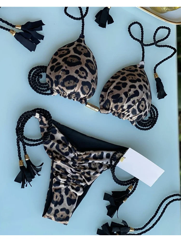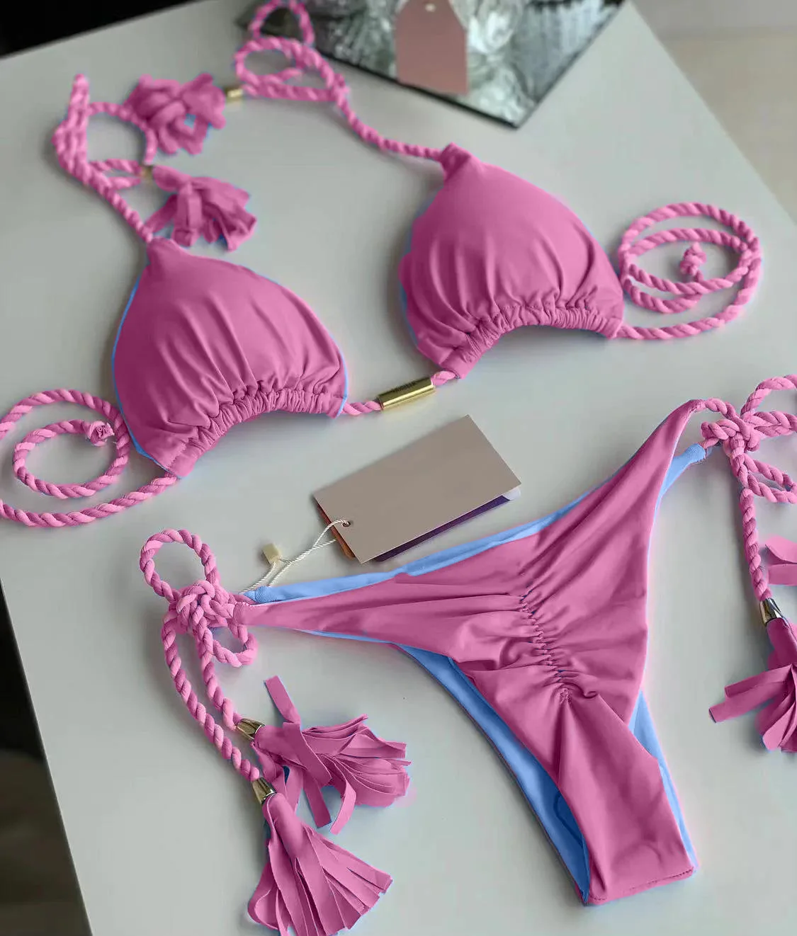 Turn heads in this playful braided tassel bikini set, featuring a soft ruched finish and eye-catching contrast lining. Designed with adjustable ties for a perfect fit, it blends comfort with bold, beach-ready style.