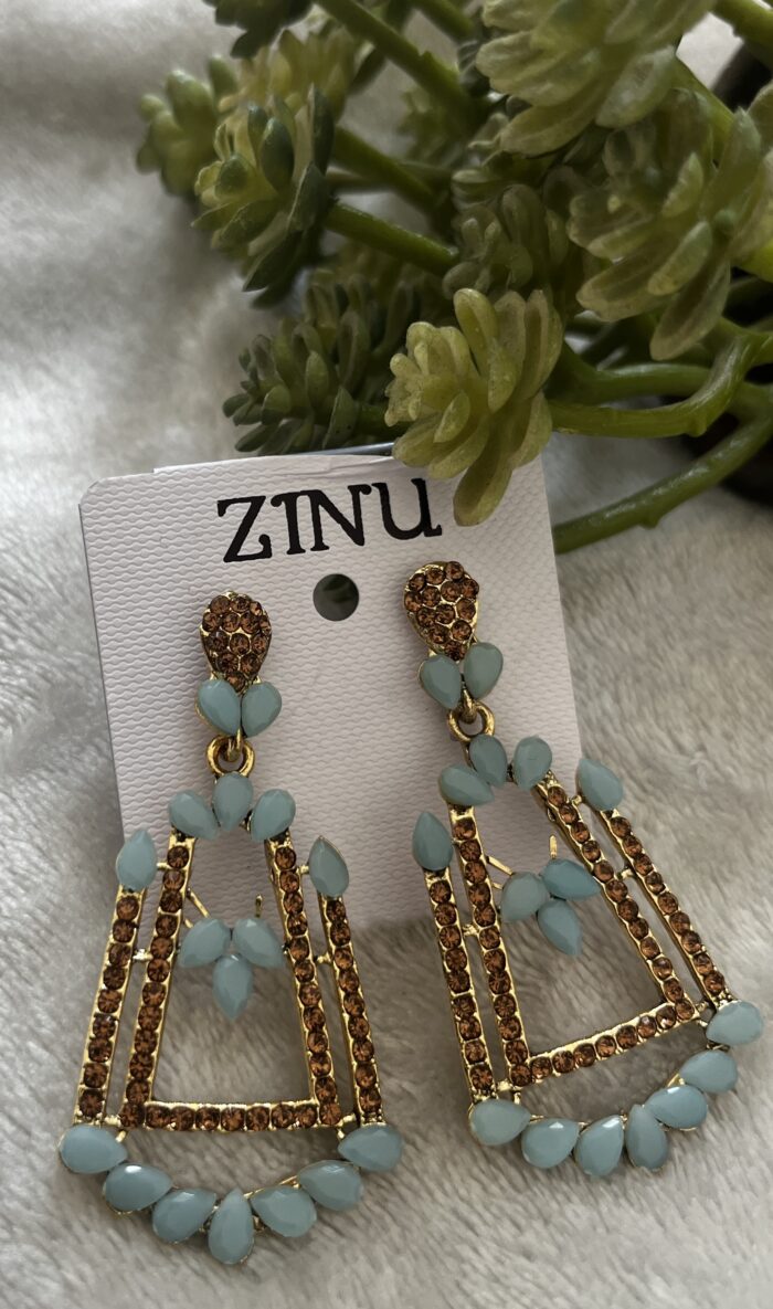 Gold-tone earrings with brown crystals and light blue teardrop-shaped accents in a geometric design.