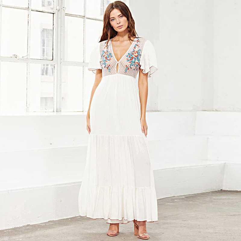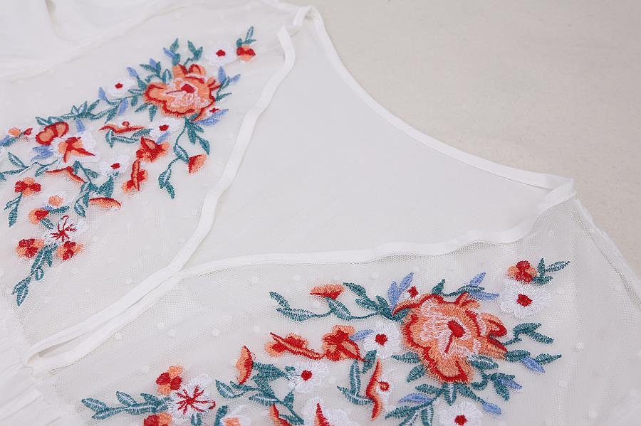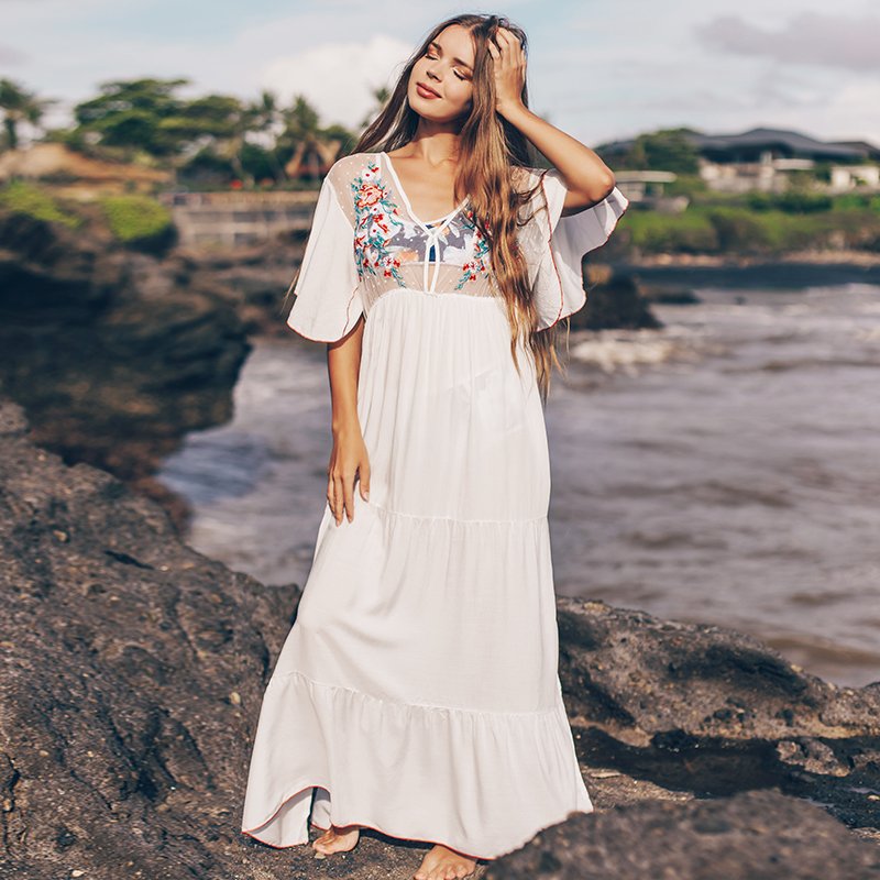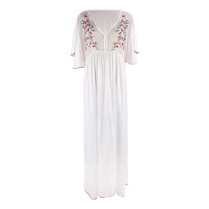 Effortlessly elegant and perfect for warm-weather occasions, this kaftan blends comfort with delicate detailing. Crafted from a lightweight, flowy fabric, it features a flattering V-neckline accented by intricate floral embroidery that adds a touch of artisanal charm.