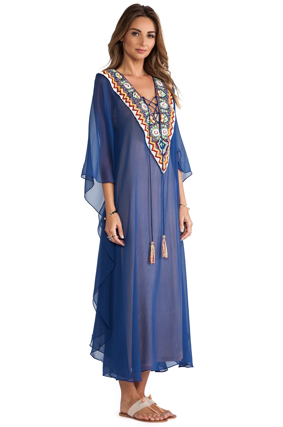 Designed with a flowing silhouette, this kaftan features a lightweight, airy fabric that drapes beautifully for a relaxed yet sophisticated look. The deep V-neckline is adorned with intricate, colorful embroidery that adds a vibrant bohemian touch, while the lace-up front with tassel ties enhances its artisanal charm.