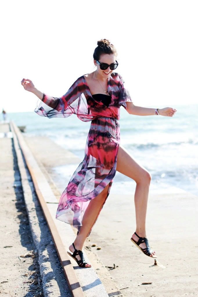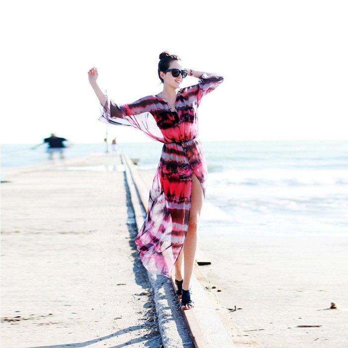 Turn heads by the shore with this effortlessly chiffon chic maxi cover-up. Designed in a vibrant tie-dye pattern, this lightweight piece features a breezy, flowy silhouette that moves beautifully with every step. The semi-transparent fabric makes it perfect for layering over your favorite swimwear, while the front buttons with a deep split adds a touch of allure and freedom of movement.