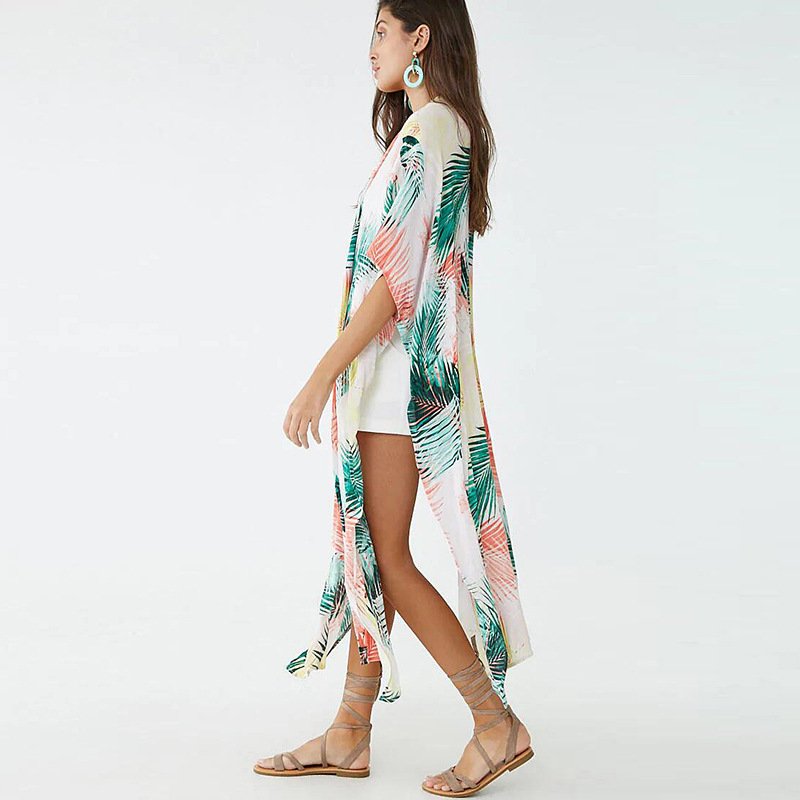 The vibrant palm leaf print adds a fresh, tropical vibe, while the relaxed, open-front design makes it easy to throw on and go. Wide sleeves enhance the flowy silhouette, creating a flattering and elegant look for any body type.