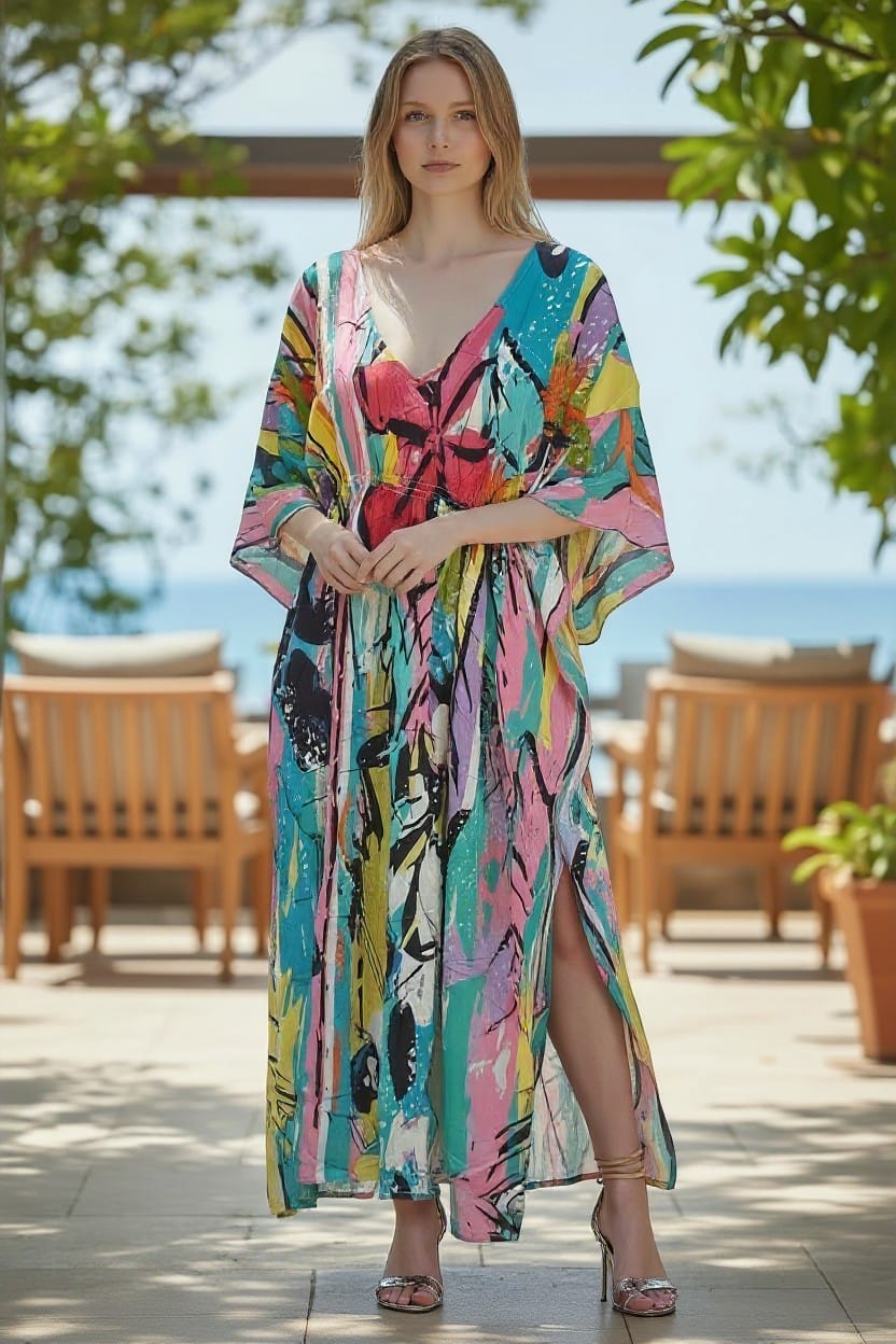 Make a statement with this colorful printed kaftan dress, designed with a relaxed fit and flowing silhouette for effortless elegance. Featuring a striking abstract print, a flattering V-neckline, and airy sleeves, it offers both comfort and style. The lightweight fabric and side slit add a graceful touch, making it perfect for beach vacations, resort wear, or summer outings.
