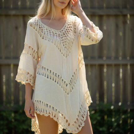 This elegant boho-style tunic features beautiful crochet detailing and a relaxed, flowy silhouette. Designed with airy sleeves and a lightweight